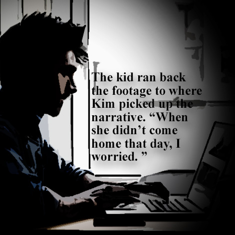 The kid ran back the footage to where Kim picked up the narrative. “When she didn’t come home that day, I worried. I always do. But I know her. I called around. I went around. Nobody had seen her. I got more worried. She needed her medication. After day two, I called Paul. He told me to notify missing persons, and that he’d check the hospitals. That was all he could do.” Kim’s face tensed trying to keep from losing it. “I had found something. I wanted him to see it. Maybe it’d help.”