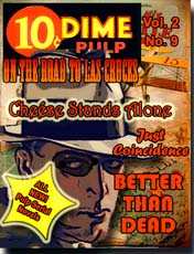 Dime Pulp continues its crime spree with two new pulp fiction serializations, Cheése Stands Alone by Phyllis Haldursdottir and Just Coincidence by Pierre Anton Taylor, as well as the continuing serialization of the pulp crime fiction of Better Than Dead, A Detective Story and the Western, On The Road To Las Cruces . If you’ve made it this far, go ahead and follow the links below to reading entertainment with the serial contents of Volume Two, Number 9